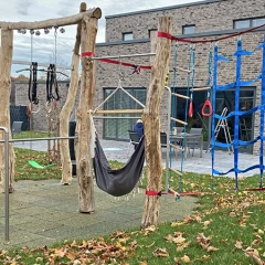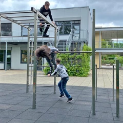 Eine Gruppe von fünf Kindern, warm eingepackt in Winterkleidung, vergnügt sich auf einem bunten Klettergerüst auf einem Spielplatz im Freien. Das Klettergerüst ist ein kleines, kuppelförmiges Klettergerüst aus gelben, roten und blauen Stangen. Die Kinder, die alle fröhlich lächeln, befinden sich an verschiedenen Stellen des Gerüsts: Zwei sitzen oben, zwei stehen und eines hängt an der Seite. Der Boden unter dem Klettergerüst ist mit WARCO Fallschutzmatten ausgelegt, die eine sichere Spielfläche bieten. Im Hintergrund ist ein Backsteingebäude mit großen Fenstern zu sehen, das eine sichere und einladende Umgebung widerspiegelt.
