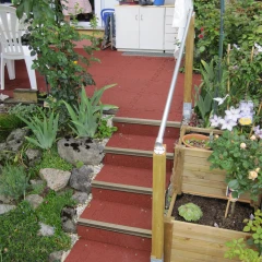 Ein Treppenbelag von WARCO erfüllt diese Anforderungen und noch viel mehr. Denn er besteht aus PU-gebundenem Gummigranulat und hat eine griffig-raue, leicht körnige Oberfläche. Das macht ihn von Natur aus rutschfest. Und das sowohl bei Nässe als auch bei Trockenheit. Außerdem leitet dieser Treppenbelag Wasser rasch ab und die Oberfläche trocknet schnell.