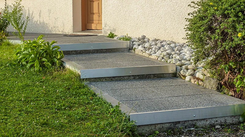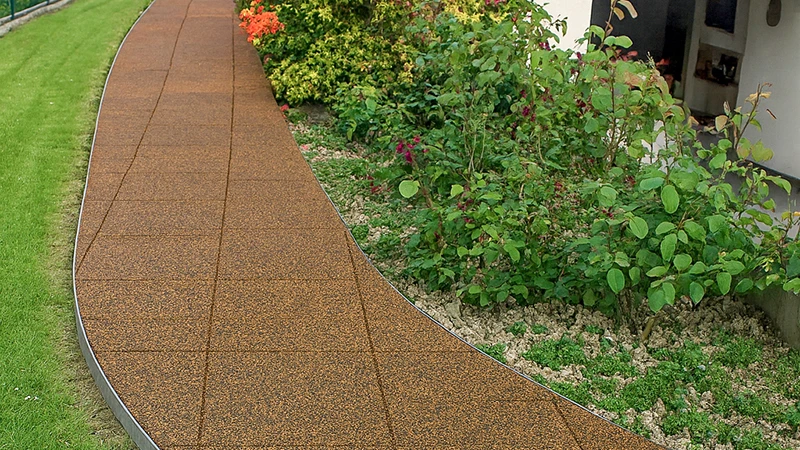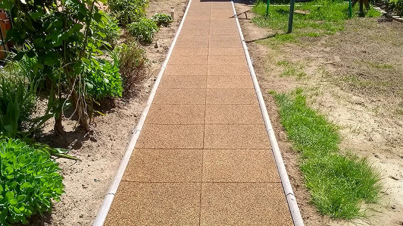Con le piastrelle in granuli di gomma legati in PU di WARCO crei vialetti durevoli e resistenti alle intemperie, facili da posare e piacevoli da percorrere – a piedi nudi, con scarpe da giardino o persino con i tacchi alti.