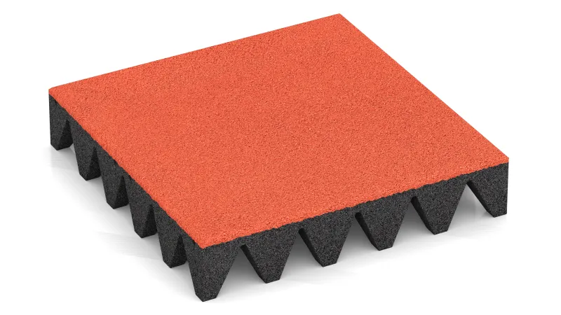 Les dalles sont fabriquées en granulats de caoutchouc liés au PU, avec une surface antidérapante et résiliente. L’épaisseur et la densité déterminent l’absorption des chocs et la hauteur de chute certifiée selon EN 1177. Le format 50 × 50 cm réduit les découpes et permet de remplacer facilement les dalles individuelles si nécessaire.