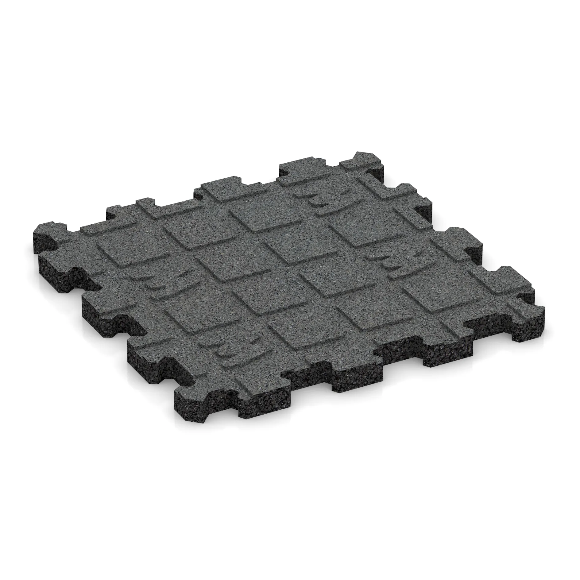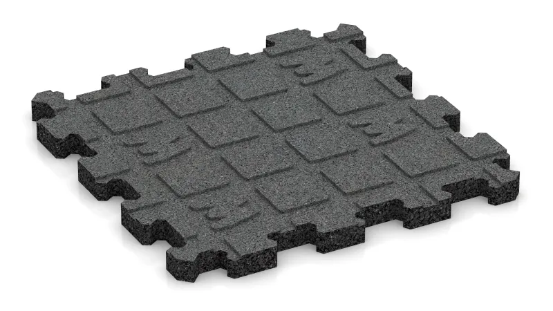 Une application typique est un îlot de jeux dans une zone piétonne pavée ou dans une cour d'école posée de dalles antichoc. La dalle de coin doit être toujours collée au sol existant.