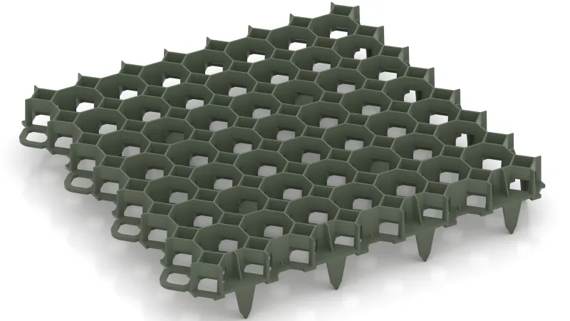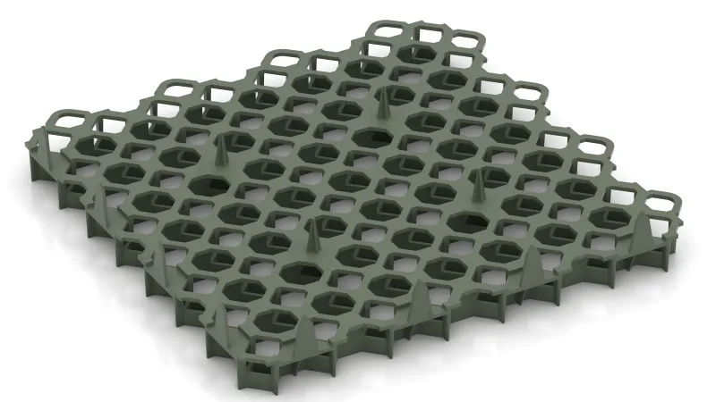 Sous chaque dalle se trouvent des pointes d’ancrage d’environ 4 cm qui la fixent activement au sol. Deux côtés sont munis d’ergots qui s’emboîtent dans les encoches des éléments voisins, formant un système de stabilisation fiable et solidaire. Une fois remplie de gravier, la surface supporte des charges allant jusqu’à 400 t/m².