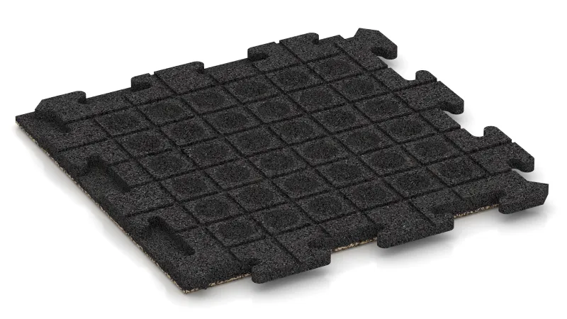 Die Fitnessboden Gummi-Fliesen Classic verfügen über eine verdeckte Puzzleverzahnung. Dabei greifen die Platten wie bei einem Puzzle ineinander, doch die Verzahnung bleibt unter der Oberfläche verborgen. So entsteht beim Verlegen eine stabile und formschlüssige Verbindung, ohne dass die Verzahnung sichtbar ist. Das Ergebnis ist eine geschlossene Fläche mit dem typischen Kreuzfugenbild – einem klaren, ordentlichen Raster, das an ein Schachbrett erinnert und der Fläche eine professionelle Optik gibt.