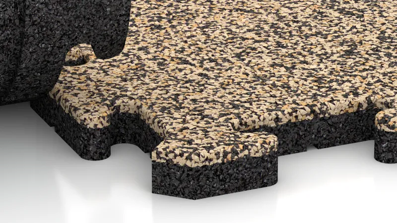 Le piastre sono realizzate in granuli di gomma legati con PU e presentano una superficie resiliente e antiscivolo. Con spessori di 3 o 4 cm offrono un assorbimento degli urti affidabile con un’altezza di posa ridotta. L’incastro puzzle sui lati garantisce un collegamento preciso e combaciante, mentre la leggera smussatura dei bordi assicura un disegno uniforme delle fughe.