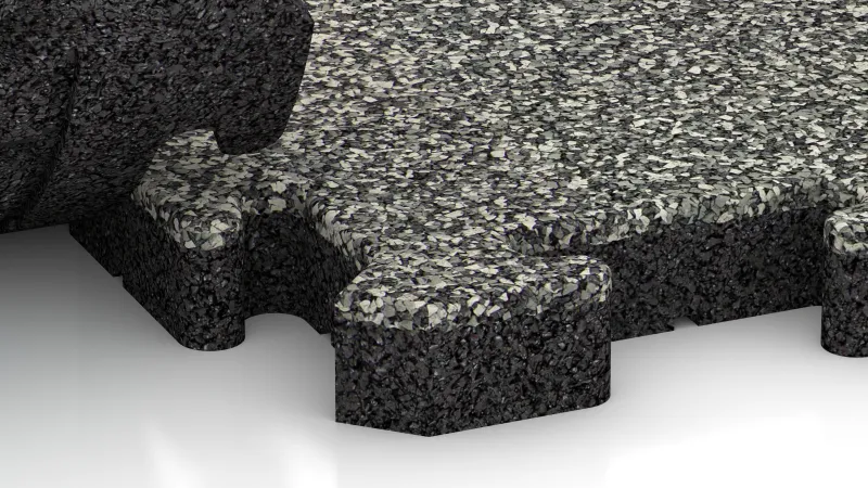 La piastra perimetrale garantisce una finitura ordinata e lineare lungo i bordi esterni di una superficie pavimentata. Ogni unità corrisponde a mezza piastra puzzle: il lato interno è dotato del consueto incastro a puzzle e si collega perfettamente alle altre piastre, mentre il lato esterno forma un bordo liscio e dritto. In questo modo l’intera superficie risulta funzionalmente ed esteticamente incorniciata.