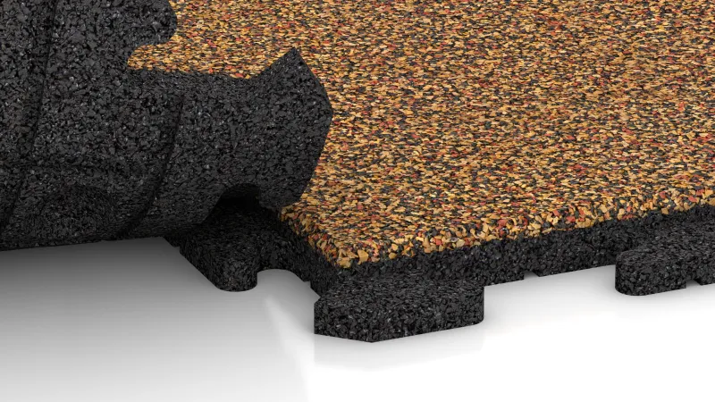 Le piastrelle sono realizzate in granuli di gomma ELT legati con poliuretano, provenienti dal recupero di pneumatici usati, oppure nella versione con uno strato superficiale colorato in granuli di gomma EPDM, completamente pigmentato e resistente ai raggi UV. Entrambe le varianti sono elastiche, robuste e rispettose dell’ambiente. La superficie è antiscivolo, ammortizzante e permeabile all’acqua: la pioggia può filtrare naturalmente nel terreno, mantenendo il suolo traspirante e le radici sane.