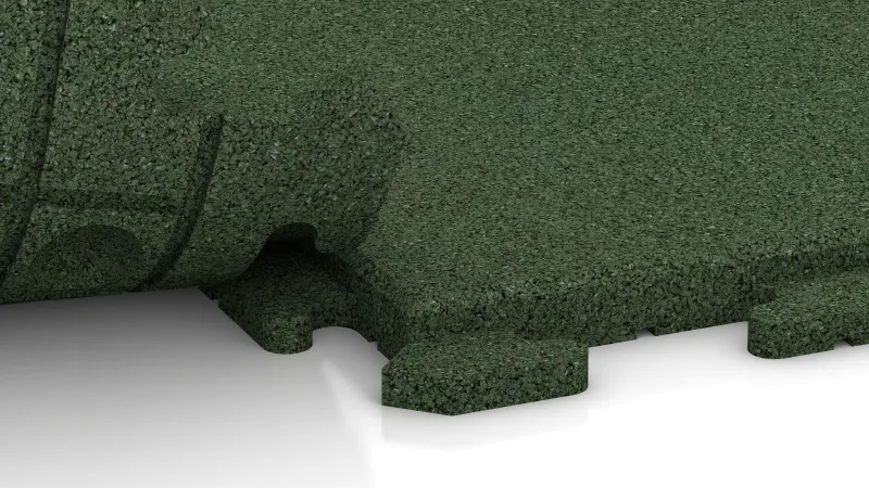 Le piastrelle sono realizzate in granuli di gomma ELT legati con poliuretano, provenienti dal recupero di pneumatici usati, oppure nella versione con uno strato superficiale colorato in granuli di gomma EPDM, completamente pigmentato e resistente ai raggi UV. Entrambe le varianti sono elastiche, robuste e rispettose dell’ambiente. La superficie è antiscivolo, ammortizzante e permeabile all’acqua: la pioggia può filtrare naturalmente nel terreno, mantenendo il suolo traspirante e le radici sane.